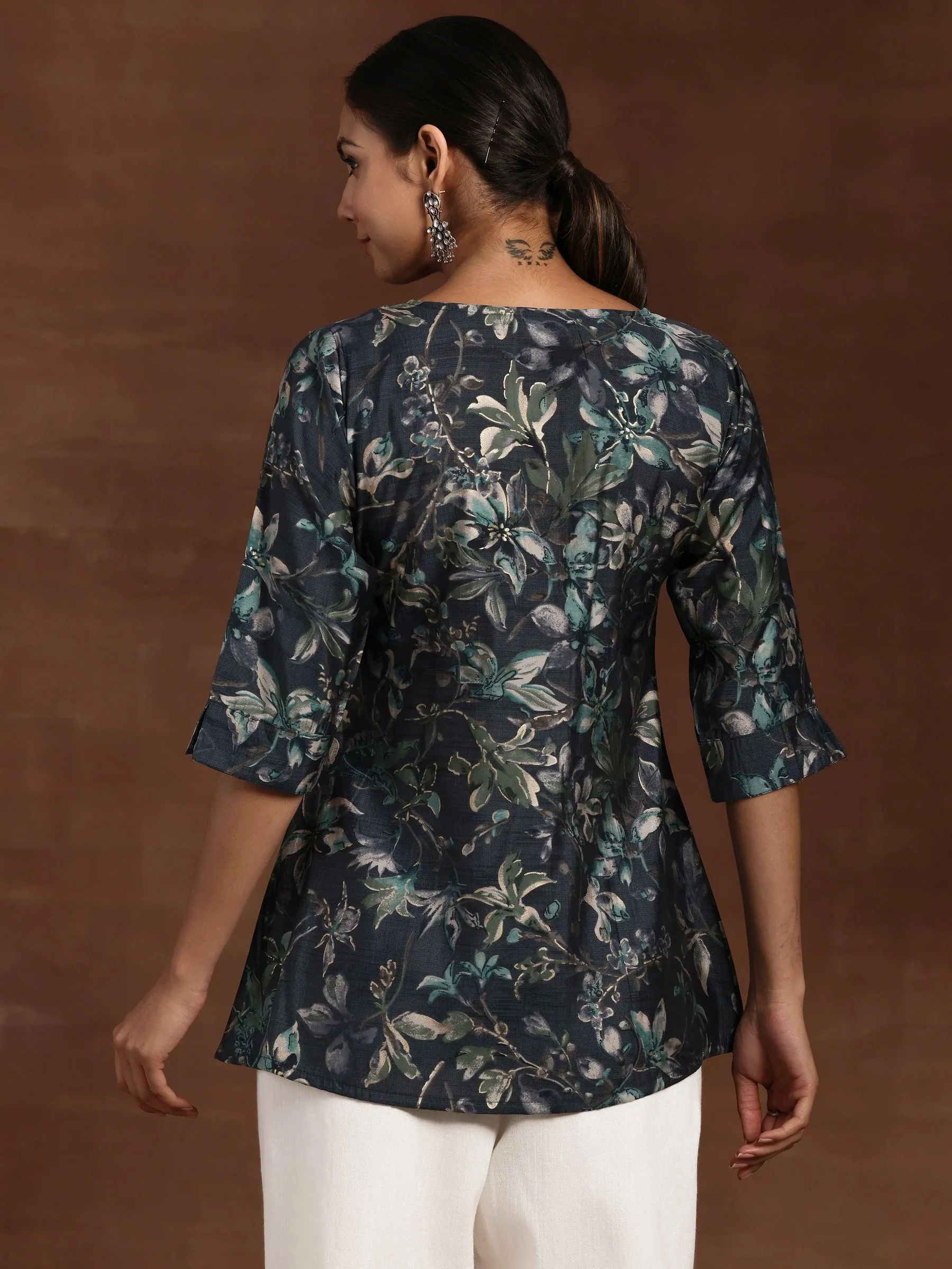 Blue Printed Cotton Blend Straight Short Kurti